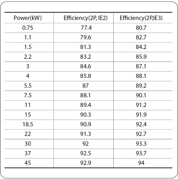5. มาตรฐานประสิทธิภาพมอเตอร์: 11KW ถึง 45KW: IE3, อื่น ๆ : IE2 ค่าประสิทธิภาพเฉพาะตามตารางด้านล่าง