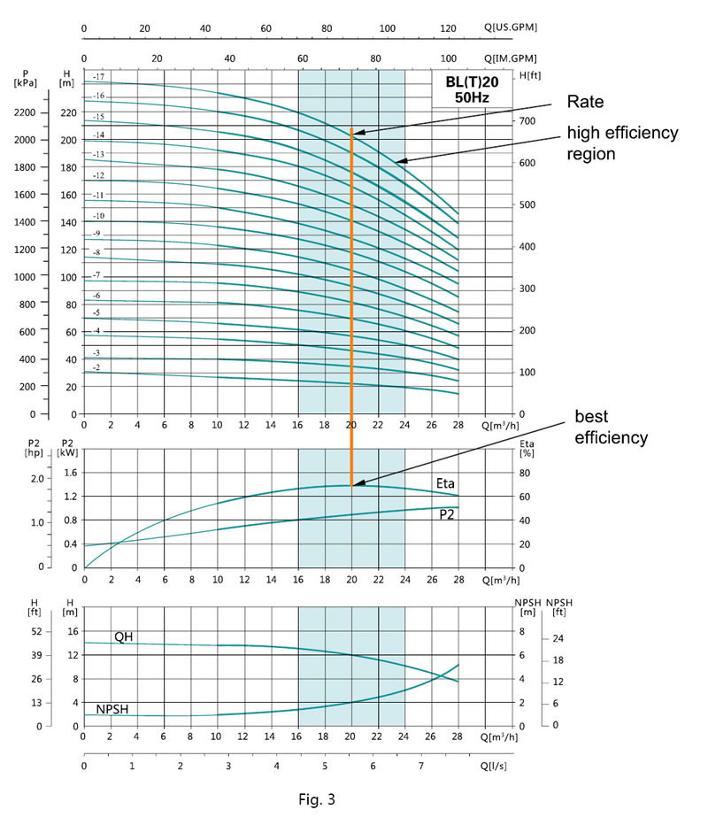 จากจุดทำงาน มันเป็นไปได้ที่จะเลือกปั๊มบนพื้นฐานของแผนภูมิเส้นโค้งที่แสดงในข้อมูล " เทคนิค/เส้นโค้งประสิทธิภาพ "